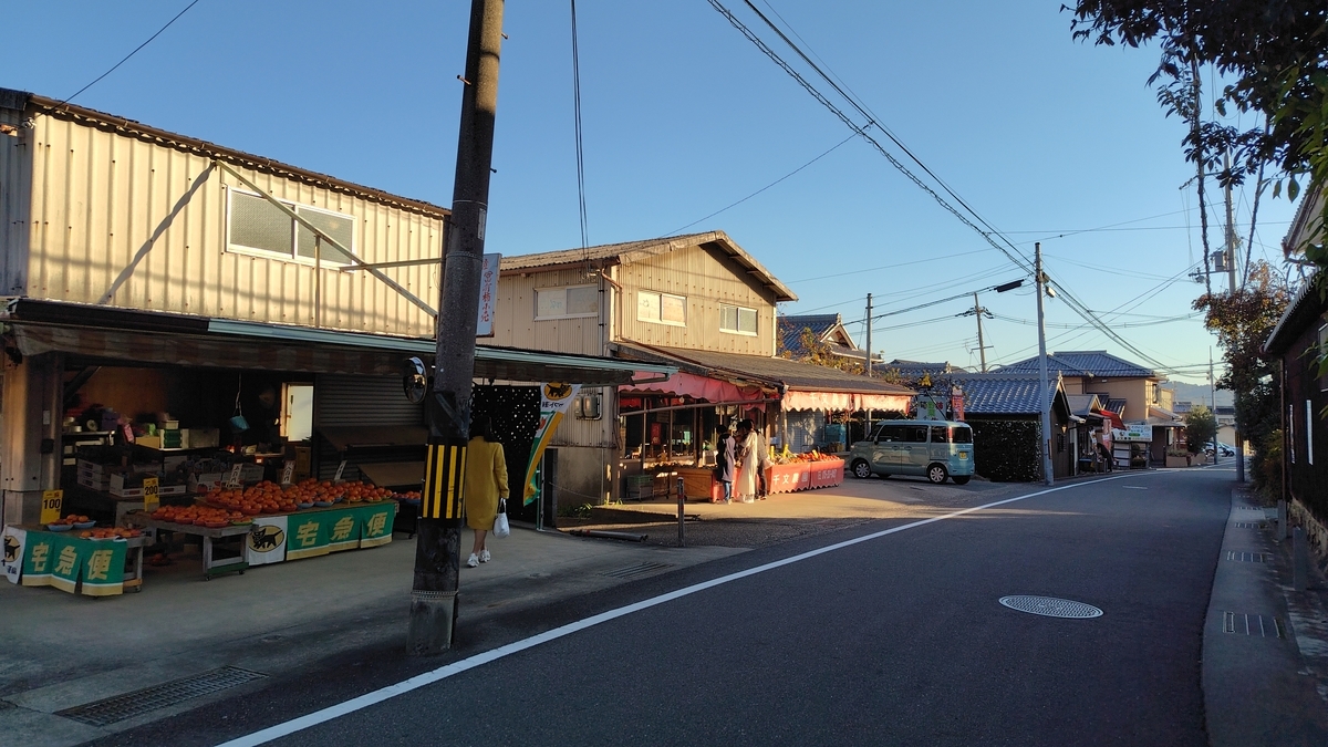 大枝と言えば、知る人ぞ知るの感があるが、「柿の里」である。1930年頃に他県から柿が導入されて以来、産地として発展したそうだ。現代の山陰街道である国道9号沿いが市街化する以前の1970年代までは、柿の時期になれば沿道に露店が建ち並んでいた。今は集落の中の道沿いの家々の軒先に「直売所」が出て、「柿街道」と言われている。柿畑は、主に集落の西側、西山の麓の傾斜地に広がっている。実りのこの時期、柿の実と葉、そして山の樹々と相まって、一面が橙色の世界となる。
