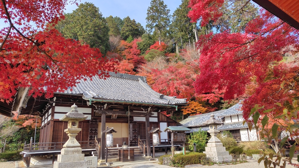 大原野地区でもう一つ触れなくてはならない社寺が、善峯寺。山号はまさに西山。京都市域の最も西、標高約300mの山腹に多くの堂宇が建つ山寺である。春は桜、夏は紫陽花など一年を通して花の寺だが、高所ならではの眺望が素晴らしい。眼下彼方に京都市街、その向こうの比叡山、大文字山など東山連峰が霞んで見える。しかし秋のこの時期、この素晴らしい眺望よりも、境内外の随所の紅葉に目を奪われる。長さ40mに及ぶ天然記念物「遊龍の松」も影が薄くなる。